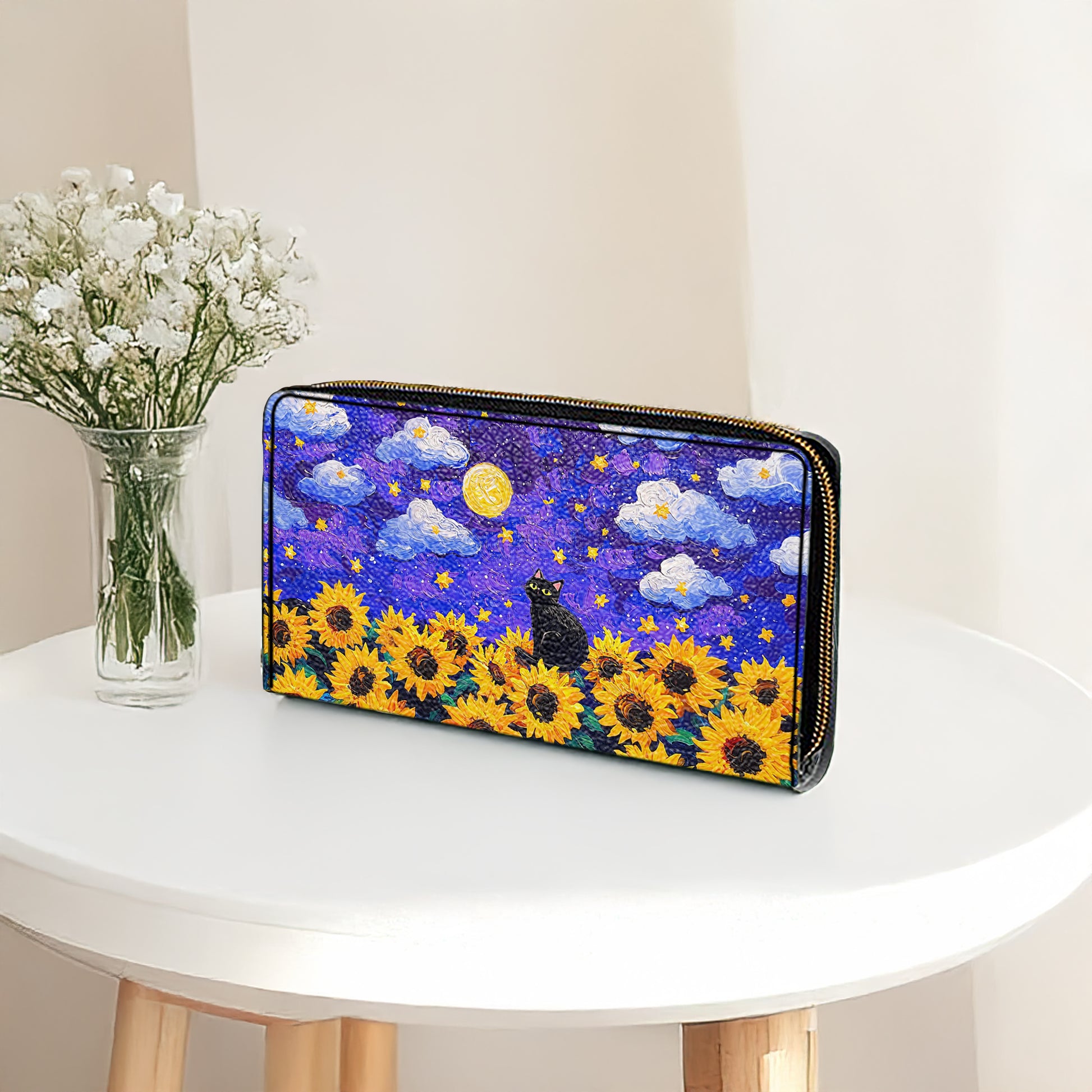 Shineful Leather Clutch Purse With Wristlet Strap Handle Starry Cat With Sunflower