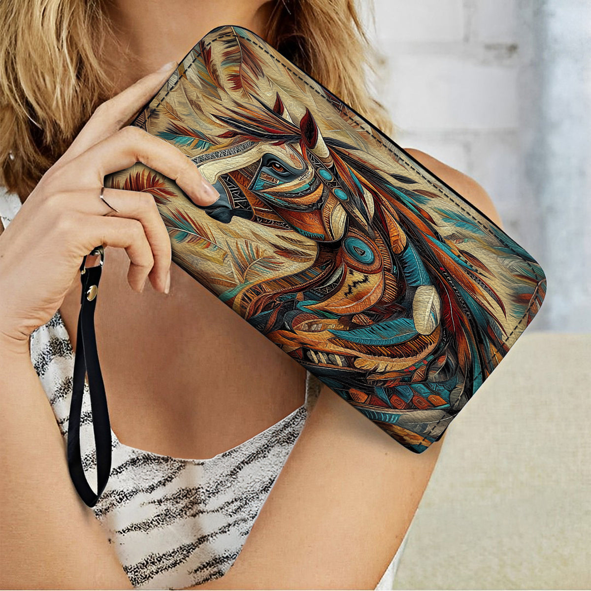 Shineful Leather Clutch Purse With Wristlet Strap Handle Tribal Spirit Stallion