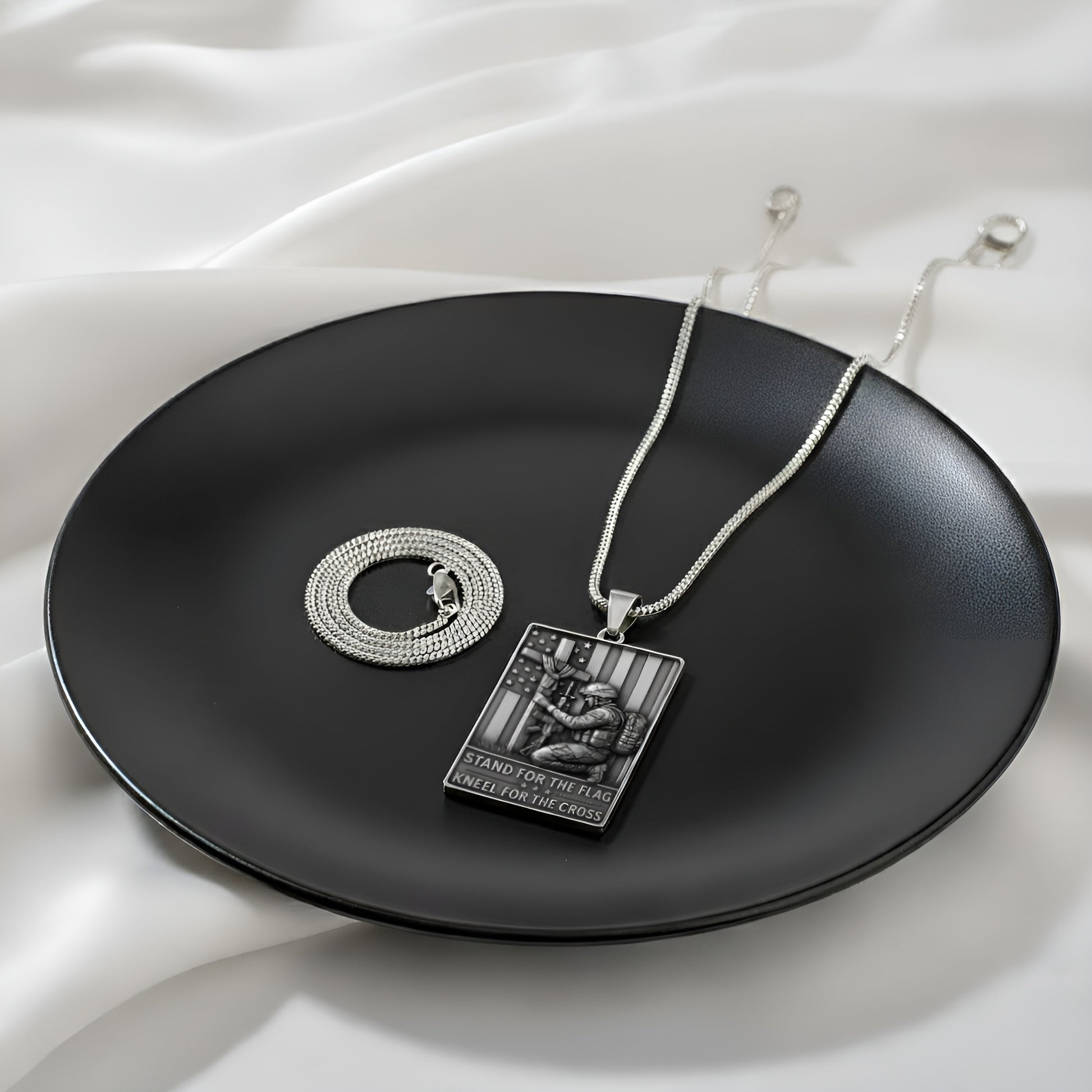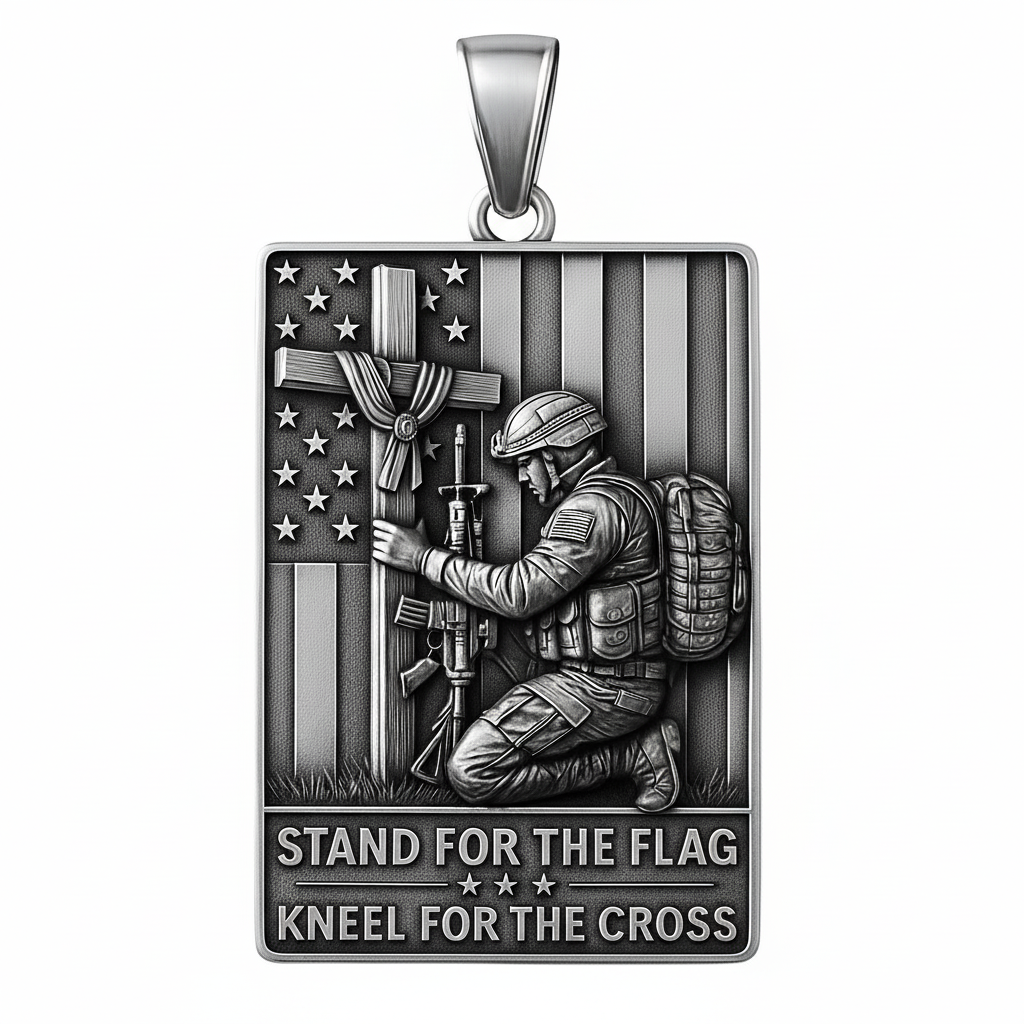 Crafted in solid sterling silver, the design shows a soldier kneeling before the cross, with the American flag as his backdrop. The words “STAND FOR THE FLAG, KNEEL FOR THE CROSS” honor both country and faith — the two guiding lights of every warrior’s journey.