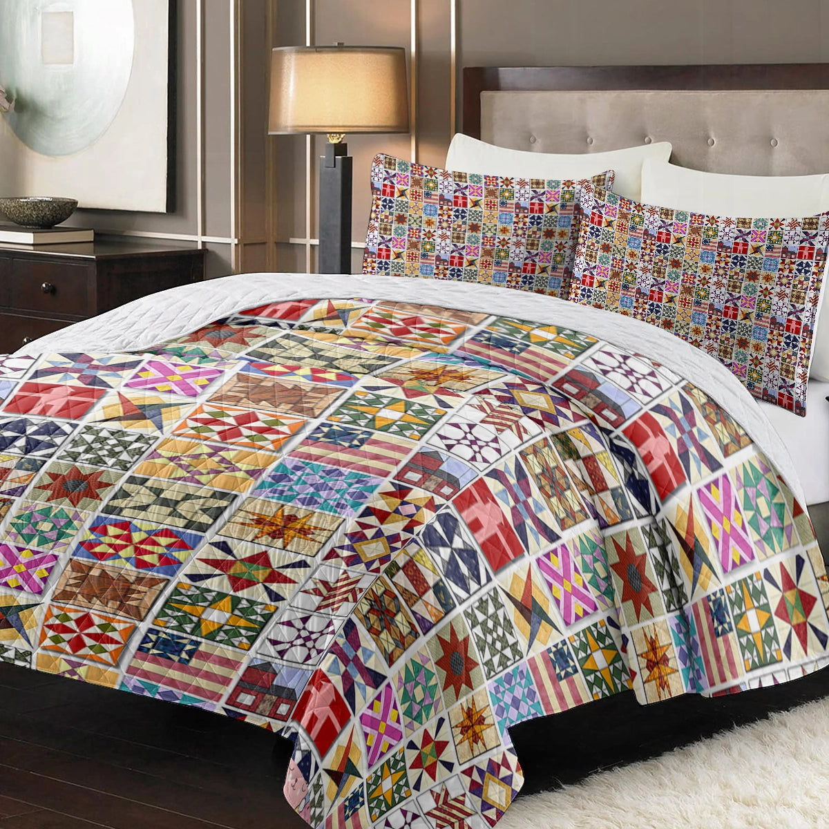 Transform your bedroom into a serene sanctuary with The Shineful Quilt Set. The rich, vibrant colors and unique artworks breathe new life into your space, while adding a touch of personality and timeless elegance. Crafted with attention to detail, each piece invites you to relax in style. This quilt set is more than just bedding—it’s a statement of comfort and sophistication. Let it elevate your bedroom and enhance every moment of rest