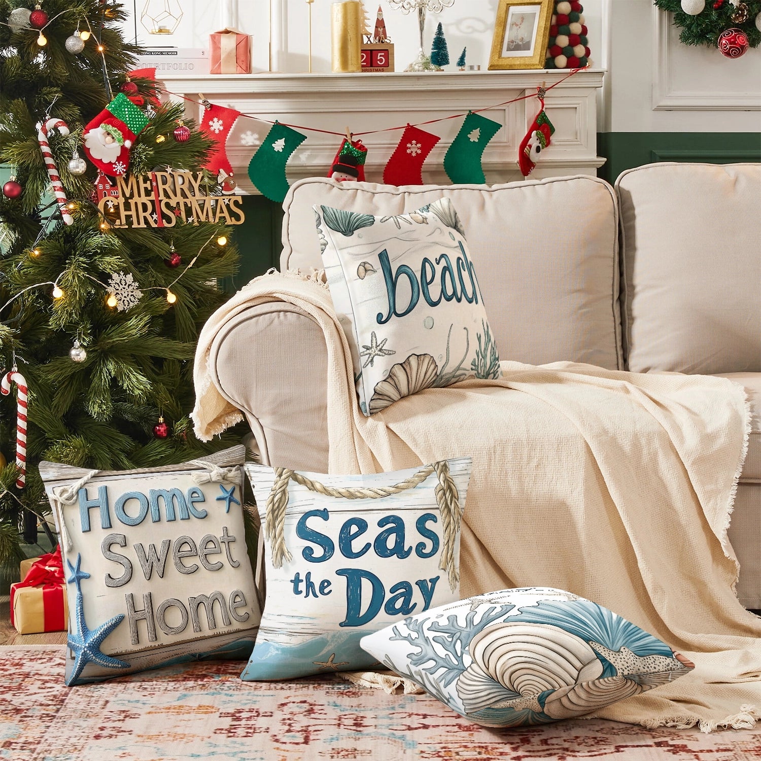 Shineful Set-4 of 2D Print Cushion Cover, Pillowcase, Pillows Covers - Beachy Bliss: A Collection of Seaside Signs and Coastal Wonders