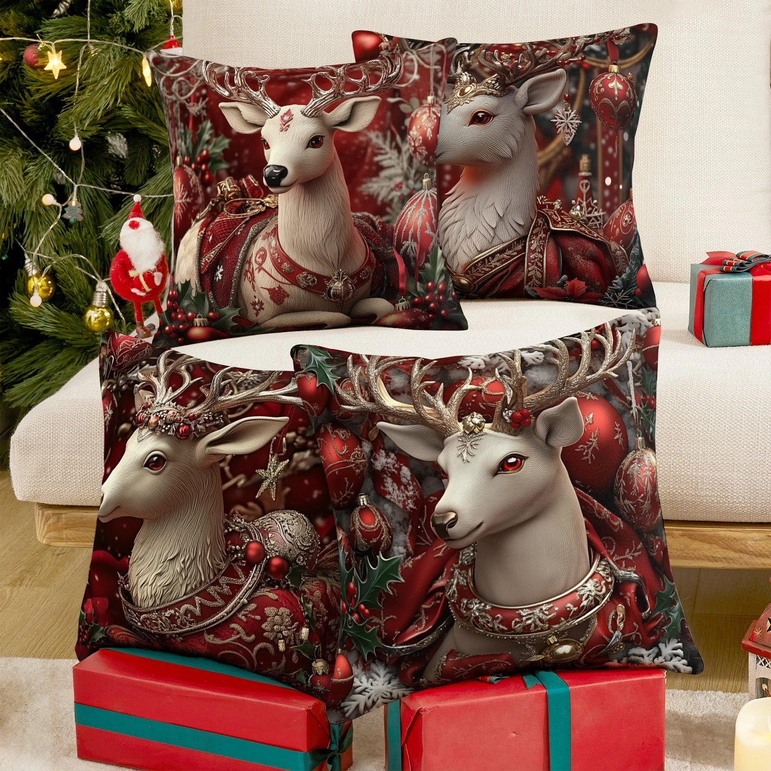 Shineful Set-4 of 2D Print Cushion Cover, Pillowcase, Pillows Covers - Exquisite Christmas Elegance: Majestic Reindeer Adorned with Festive Luxury and Holiday Charm