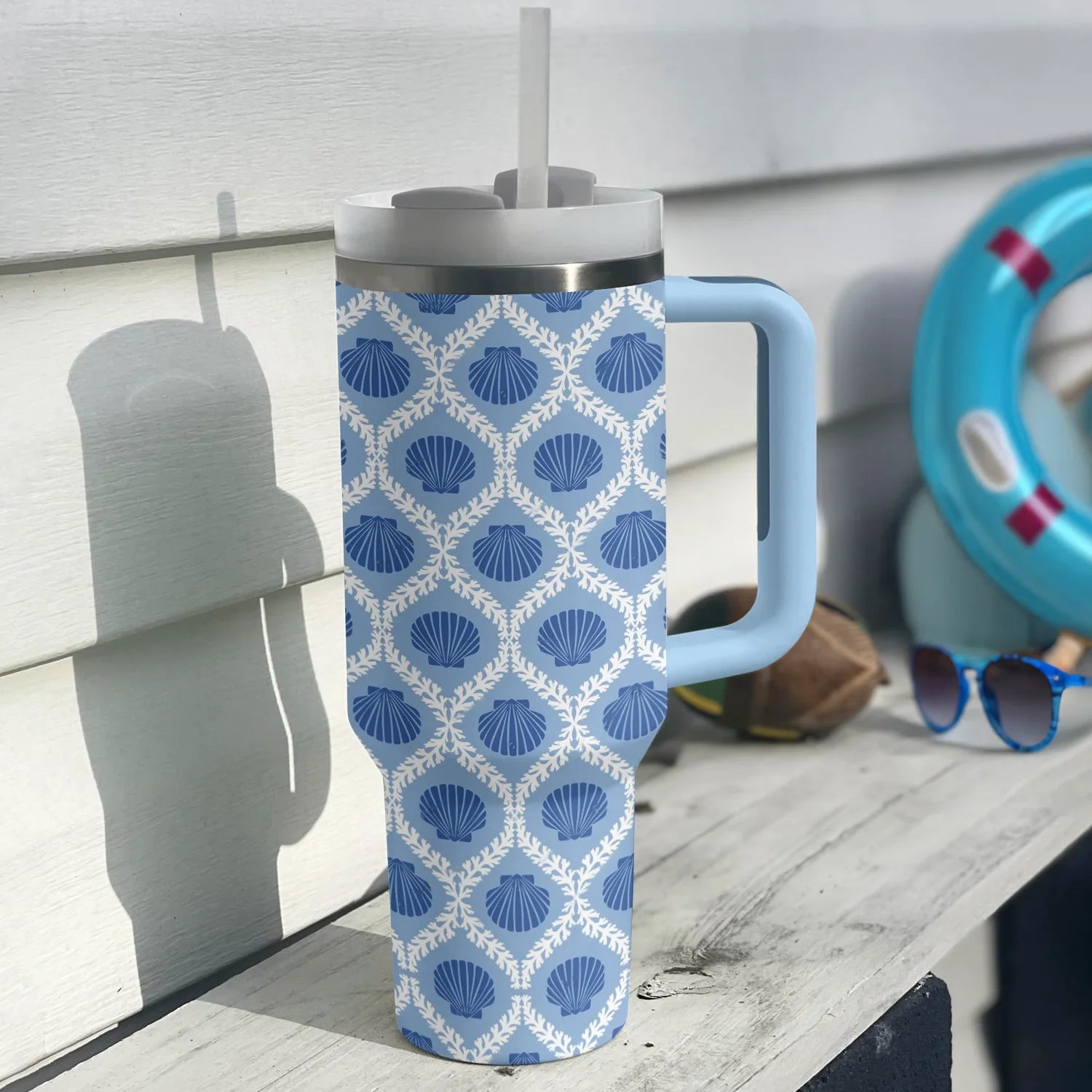 This beautifully crafted tumbler features a stunning pattern of seashells delicately arranged with intricate coral motifs, creating an elegant and timeless design. The soothing blue tones evoke the calm and peaceful essence of the sea, while the detailed seashell illustrations serve as a reminder of nature’s delicate beauty. Each shell in the design is carefully outlined to capture the natural texture and elegance, bringing a touch of coastal serenity to your everyday life. The combination of flowing coral branches surrounding the shells enhances the organic, beach-inspired theme, transporting you to tranquil shores. The design is a perfect blend of nature’s wonders and classic artistry, symbolizing purity, renewal, and the peaceful rhythms of the ocean. Whether you're enjoying a relaxing day at the beach or simply savoring a refreshing drink, this tumbler is a perfect companion to remind you of the serene beauty of the sea.